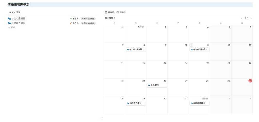 - 実施日管理予定配下のリストまたはカレンダーより1on1実施日に追加します。 ページタイトルに、1on1実施予定日、対象者にメンバーを設定します。