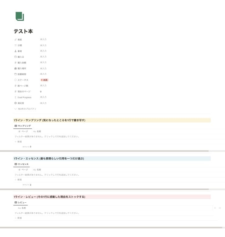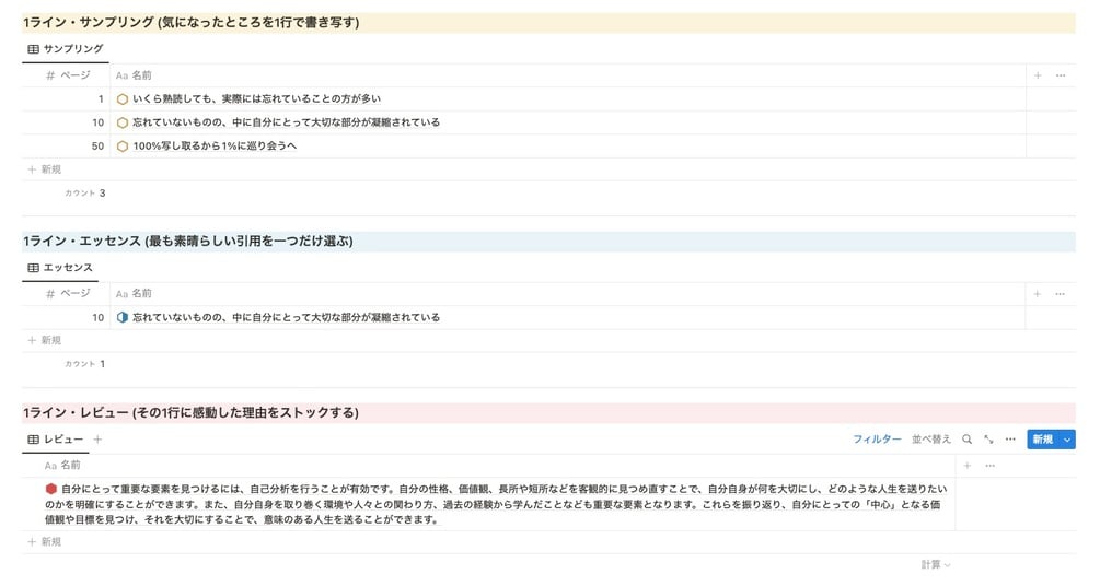 ページのプロパティに「1ライン・サンプリング」「1ライン・エッセンス」「1ライン・レビュー」を用意しています。