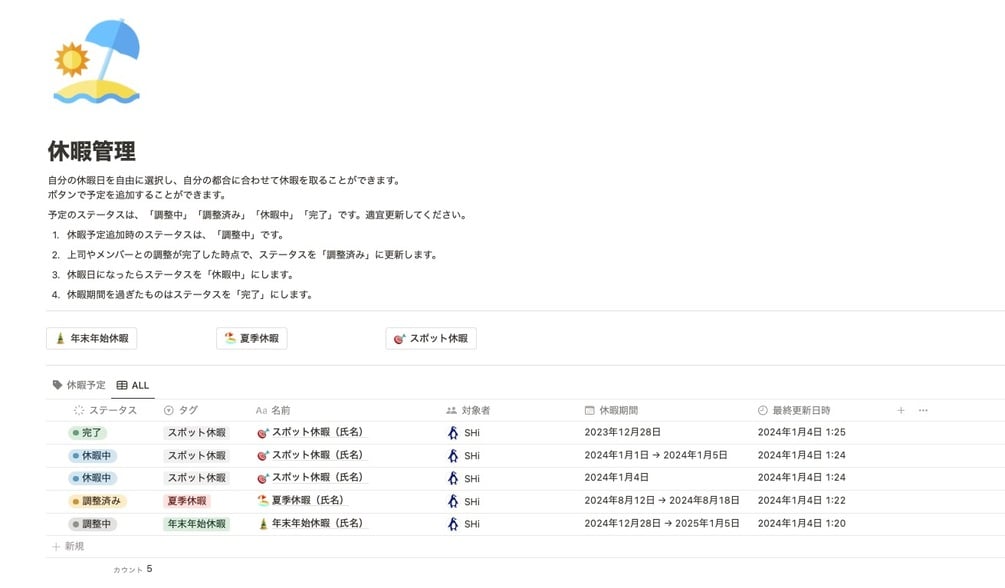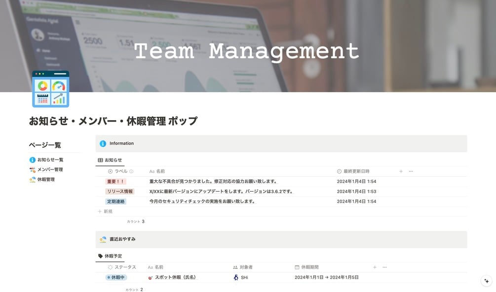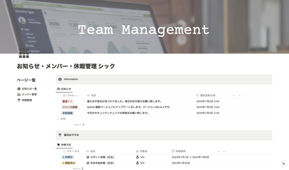 【Notion】チーム管理テンプレ(お知らせ・メンバー・休暇管理)